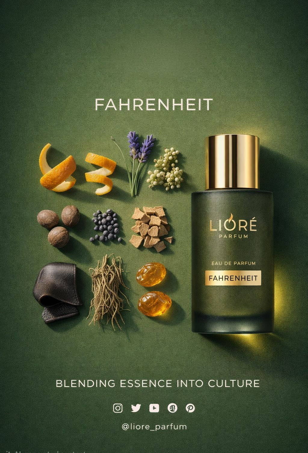 The Ultimate Expression of Bold Masculinity Fahrenheit by LIORÉ is a masterful interpretation of the legendary Dior classic. Designed for the man who is both powerful and refined, this fragrance captures the signature "gasoline" and floral leather accord that made the original a global icon. It is a scent of contrasts: hot and cold, subtle and intense.